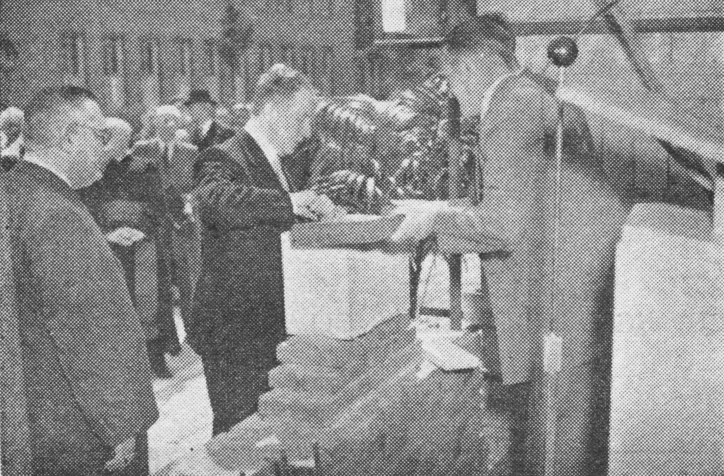 De eerste steen van wederopbouwpand De Maasbode is gered van de sloop. In de vele kilo’s zware steen bleek een loden koker met oorkonde te zitten. Ondertekend door alle belangrijke heren die op deze winderige dag in mei 1952 aanwezig waren.
